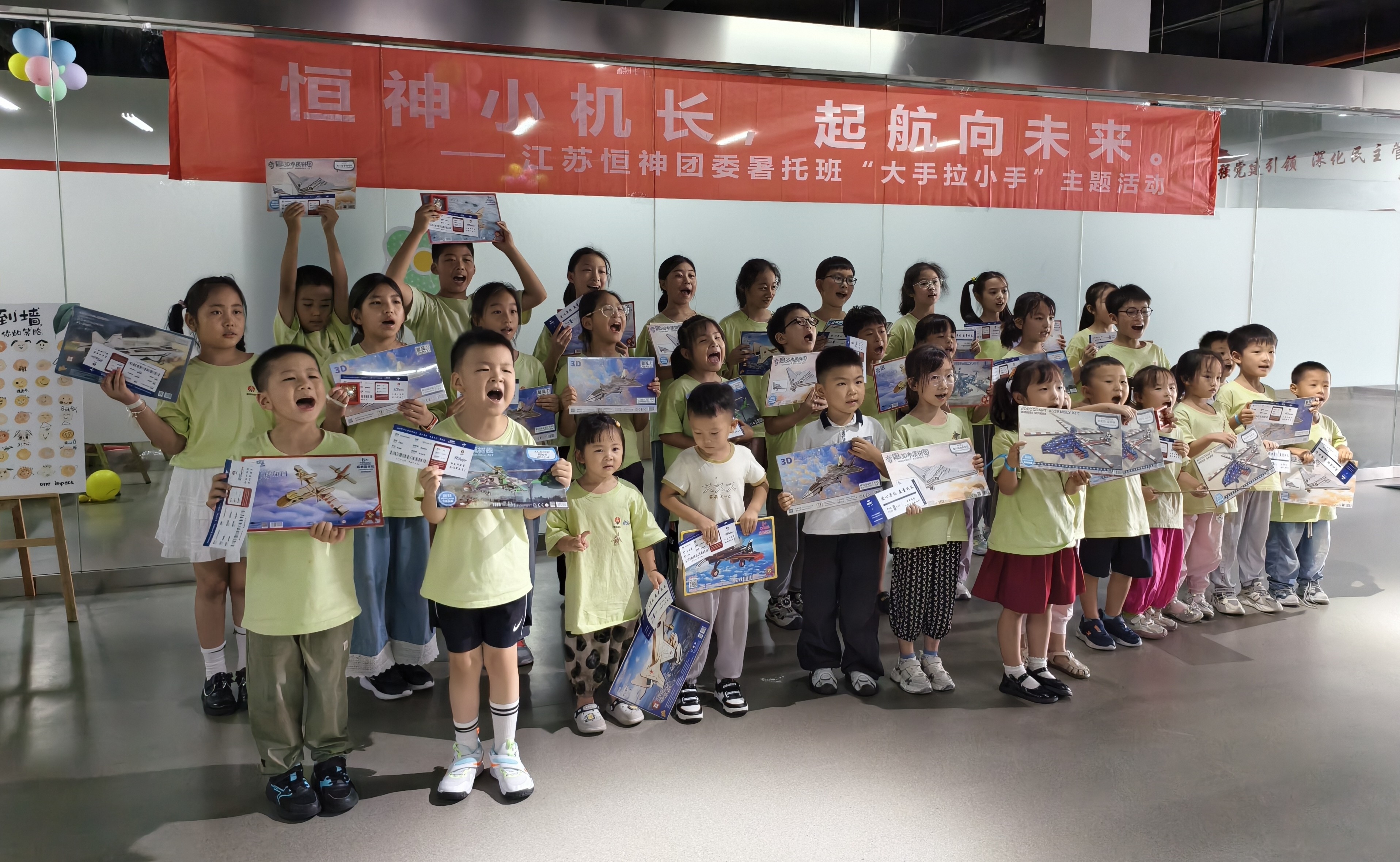 8月12日下午,恒神股份愛心暑托班的活動場地變身歡樂航空港,約50名職工子女化身 “恒神小機(jī)長”,在團(tuán)委青年們的帶領(lǐng)和陪伴下,開啟了一場充滿歡笑與成長的航空主題奇妙之旅。這場以 “恒神小機(jī)長?起航向未來” 為主題的趣味游戲活動,讓孩子們在輕松愉快的游戲中收獲了知識、初步建立了團(tuán)隊(duì)互助協(xié)作的觀念。開場破冰:舞蹈牽情誼,小隊(duì)齊集結(jié)隨著歡快的音樂旋律響起,活動正式拉開帷幕。5名團(tuán)委青年與孩子們手拉手圍成圈,跟著節(jié)奏蹦跳旋轉(zhuǎn),原本有些靦腆的小朋友們很快被活潑的氛圍感染,大廳里瞬間充滿了銀鈴般的笑聲。這場破冰舞蹈就像一根無形的線,迅速拉近了青年志愿者與孩子們的距離。在簡要的自我介紹后,大家通過抽取彩色手環(huán),分成了紅、黃、藍(lán)、綠、白五支小隊(duì),展開了一場場趣味比拼。趣味闖關(guān):航空主題游戲里的知識與協(xié)作折紙飛機(jī)環(huán)節(jié)迅速點(diǎn)燃了孩子們的激情。大家拿著 A4 紙,跟著領(lǐng)隊(duì)老師學(xué)習(xí)折疊技巧,有的還別出心裁地畫上笑臉和花紋。“三、二、一,起飛!” 當(dāng)數(shù)十架紙飛機(jī)穿過 “書架圓環(huán)” 時(shí),大廳里爆發(fā)出陣陣歡呼。“我是拼圖小能手” 環(huán)節(jié)堪稱對 “速度與協(xié)作” 的考驗(yàn)。當(dāng)飛機(jī)拼圖被分發(fā)到各隊(duì)時(shí),孩子們立刻圍坐在一起,七手八腳地開始拼接。“這塊應(yīng)該在這里!”“不對,看機(jī)翼的形狀!” 團(tuán)委志愿者們在旁耐心引導(dǎo),既不包辦代替,又及時(shí)給迷茫的小隊(duì)員們支招。最終,各支隊(duì)伍都順利完成了拼圖任務(wù)。“飛機(jī)連連看” 游戲成了記憶力大比拼。孩子們盯著倒扣的紙牌,時(shí)而蹙眉思考,時(shí)而拍手歡呼,團(tuán)委志愿者們則在一旁計(jì)時(shí)鼓勁、還要熱心的小朋友不時(shí)用掌聲鼓勵加油。最終,所有孩子都贏得了木制飛機(jī)模型拼圖,獲勝隊(duì)伍的小朋友還優(yōu)先挑選了心儀的款式。溫情收尾:徽章與機(jī)票見證成長,愛與理念扎根心間活動尾聲,每位小飛行員都領(lǐng)到了閃亮的 “恒神小機(jī)長” 徽章,驕傲地別在胸前。當(dāng)印有每個孩子名字的 “結(jié)業(yè)機(jī)票” 被鄭重頒發(fā)時(shí),不少小朋友舉著機(jī)票和模型向志愿者們開心地道謝。本次活動旨在讓職工子女在歡樂中感受航空精神,同時(shí)通過青年志愿者的陪伴,傳遞企業(yè)對員工家庭的關(guān)懷。這場持續(xù)兩小時(shí)的活動,像一根堅(jiān)韌的 “情感碳纖維”,將企業(yè)、家庭與孩子緊緊相連。恒神團(tuán)委的青年們用熱情與愛心,為孩子們的暑假添上了一抹明亮的色彩,也讓 “愛與未來一起飛” 的溫暖理念,深深扎根在每個人心中。